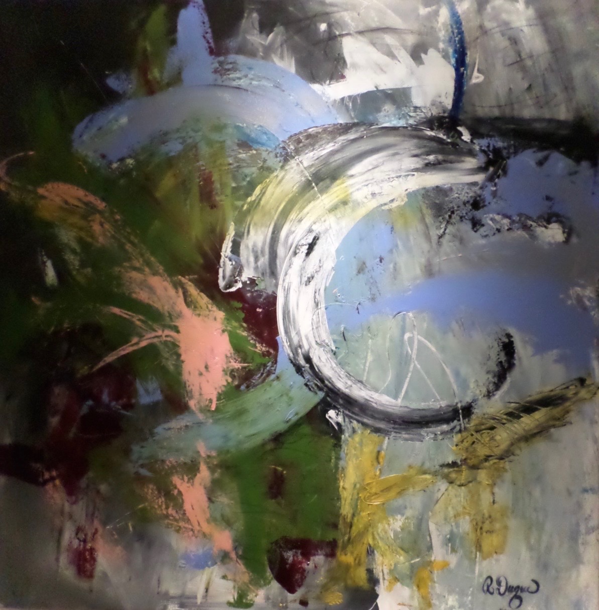 This painting tells the story of a moment when direction was no longer straight. Broad arcs of pale blue and white sweep across the surface like roads drawn in motion, curving instead of arriving. They feel decisive yet uncertain—gestures made while moving, not while knowing.
