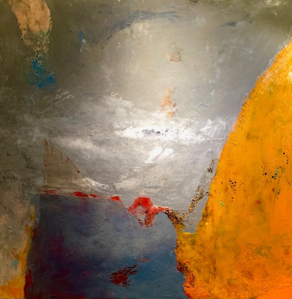 This painting tells the story of a moment after impact—after something has been broken, said, or lost. The surface feels weathered, as if time itself has pressed its palms into the paint. Cool grays and muted blues dominate the left side, heavy with quiet and restraint, while the right burns with a field of ochre and gold, rough-edged and unapologetic.