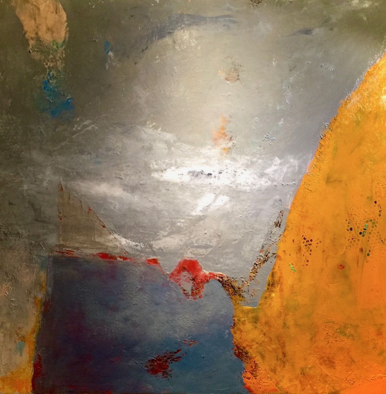 Between them runs a jagged seam, touched with red, like a memory that refuses to be fully buried. It suggests conflict, rupture, or the cost of crossing from one state of being into another. Yet the gold does not overwhelm the gray; it simply insists on existing beside it.
