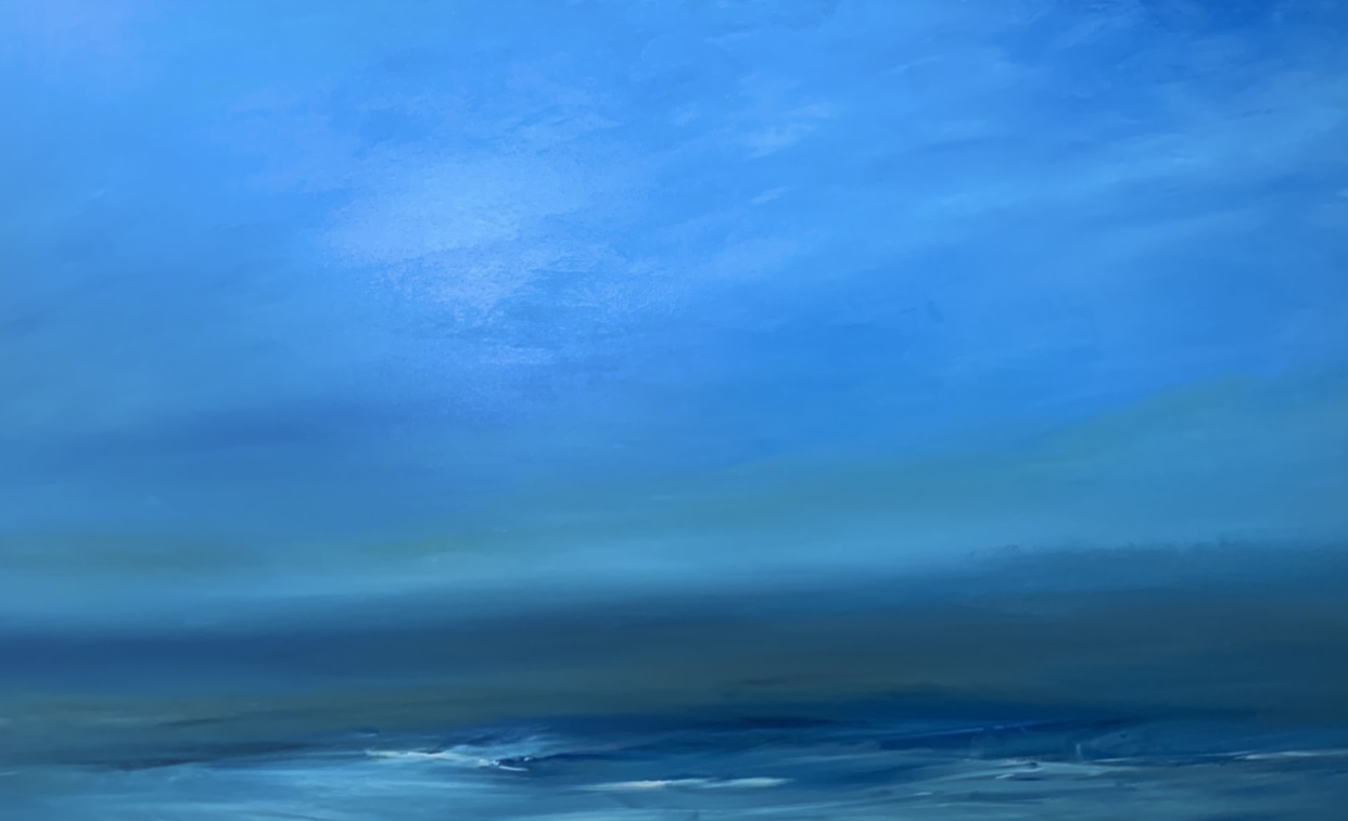 In this painting, the horizon is both an invitation and a question. The land rolls forward in soft bands of green and pale gold, but it’s the sky — wide, layered, and shifting — that carries the weight of the story. Clouds drift in uncertain rhythms, layered with light that doesn’t announce itself, but lingers quietly, like a memory just out of reach.