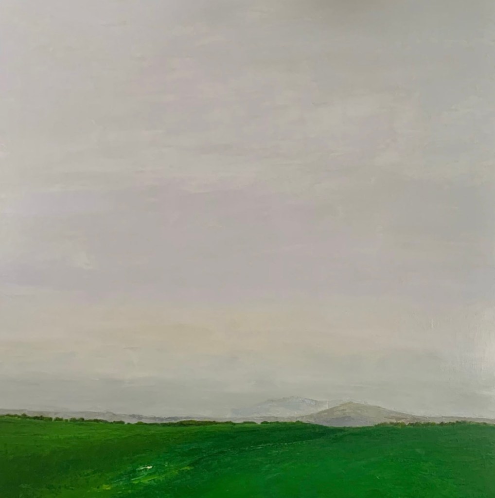 This painting tells the story of a place that exists between decisions — a wide, quiet field beneath a sky that has softened into near silence. The green land stretches forward with quiet confidence, while distant hills barely assert themselves, as if they are memories rather than destinations. Nothing here demands attention, yet everything invites it.