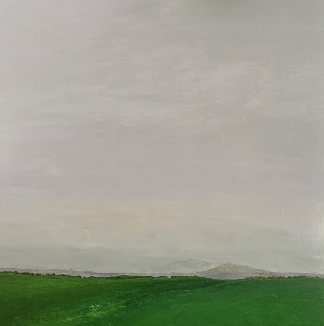 This painting tells the story of a place that exists between decisions — a wide, quiet field beneath a sky that has softened into near silence. The green land stretches forward with quiet confidence, while distant hills barely assert themselves, as if they are memories rather than destinations. Nothing here demands attention, yet everything invites it.