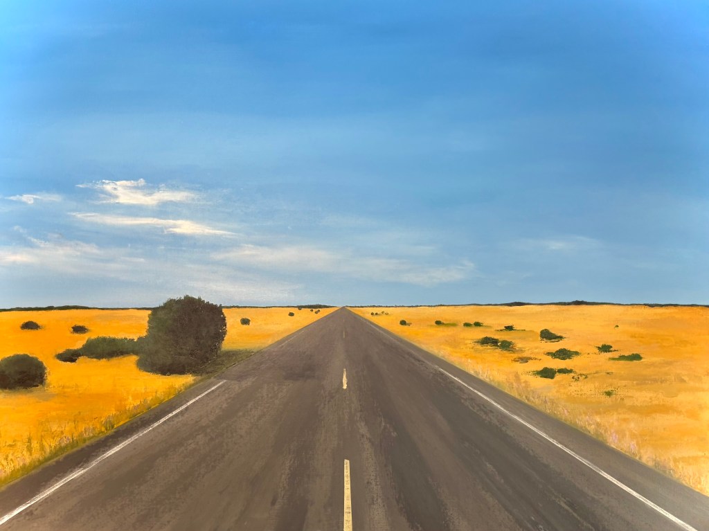 By the end, he understands that distance cannot replace honesty. Instead of continuing forward, he turns around to face the life he tried to leave. The painting becomes a meditation on courage: the moment when illusion burns away and truth, like the road, demands to be followed.